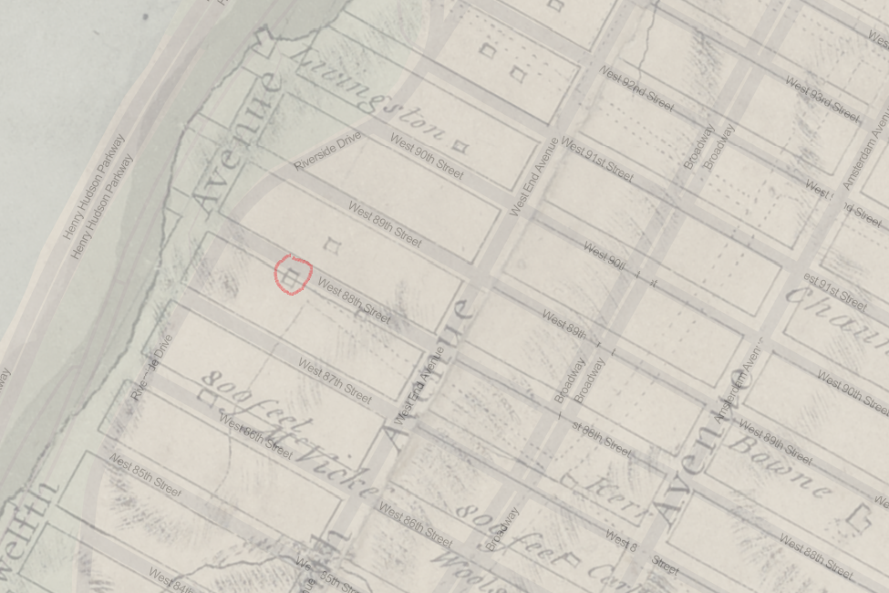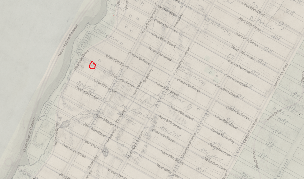 On the present city plan, the house would be south of 88th St., about 100 feet east of Riverside Drive; the farm house in the block above; the barn, “with sheds and other buildings,” in the bed of Riverside Drive at 89th St.; the other barn 100 feet to the east, partly in the bed of 89th St.